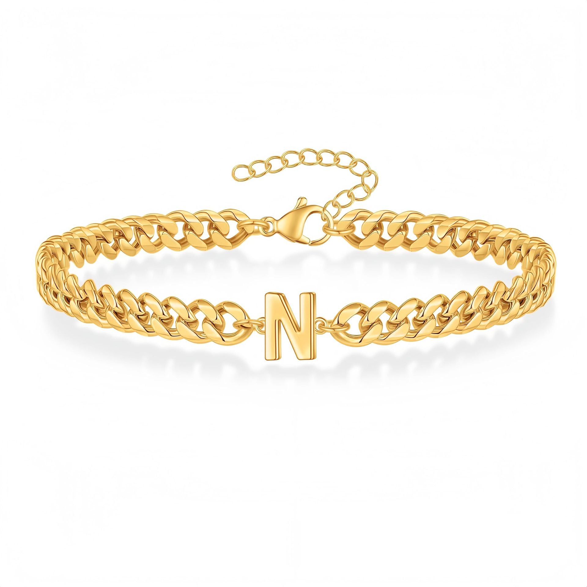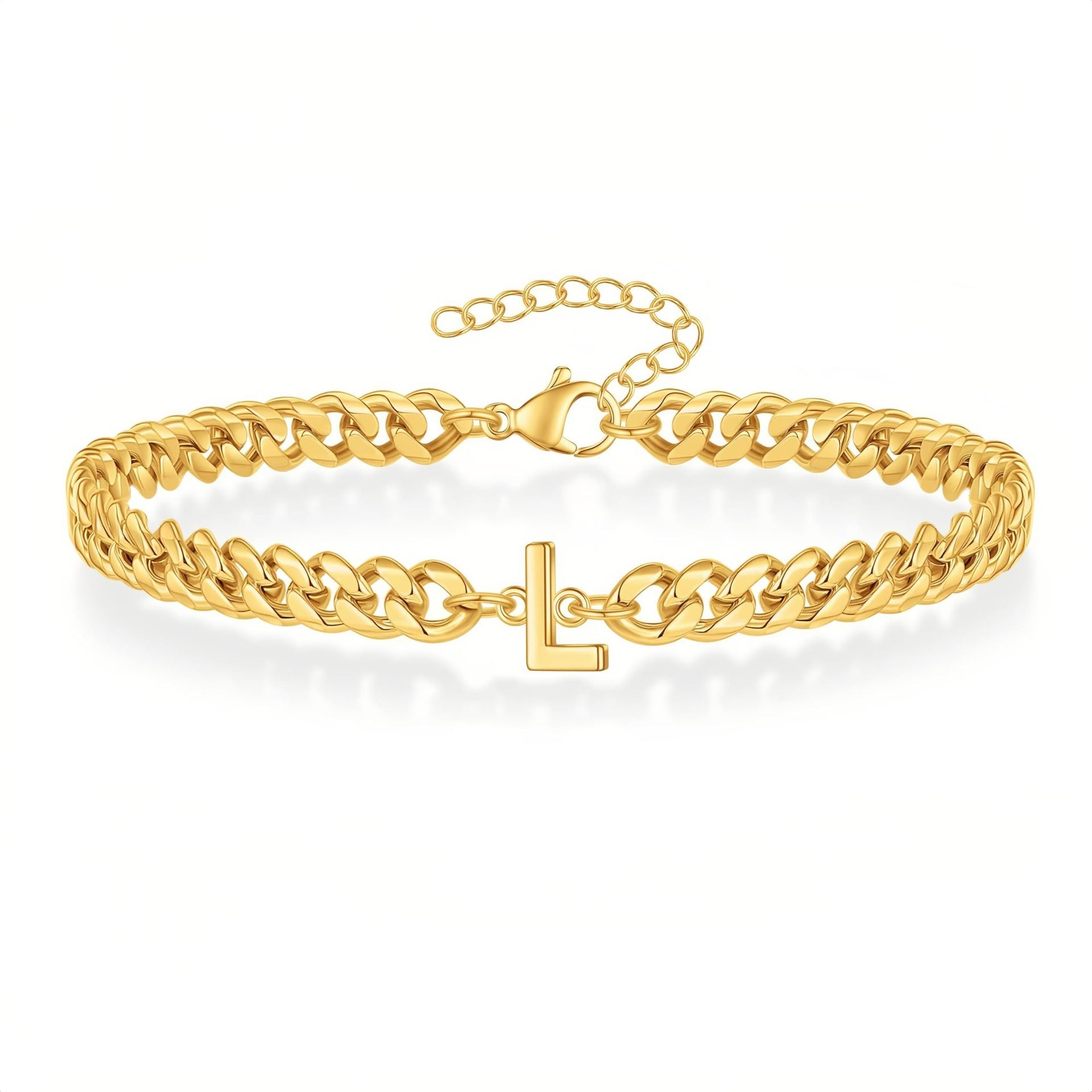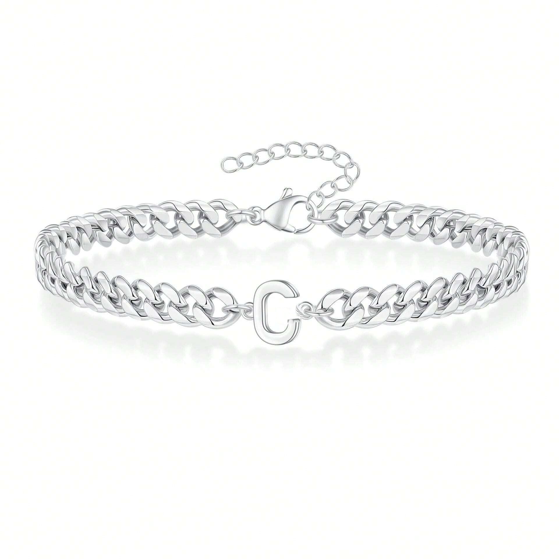 A bold curb chain bracelet with a sleek initial at its center. Its polished gold/silver finish creates a statement piece that's both elegant and personal.