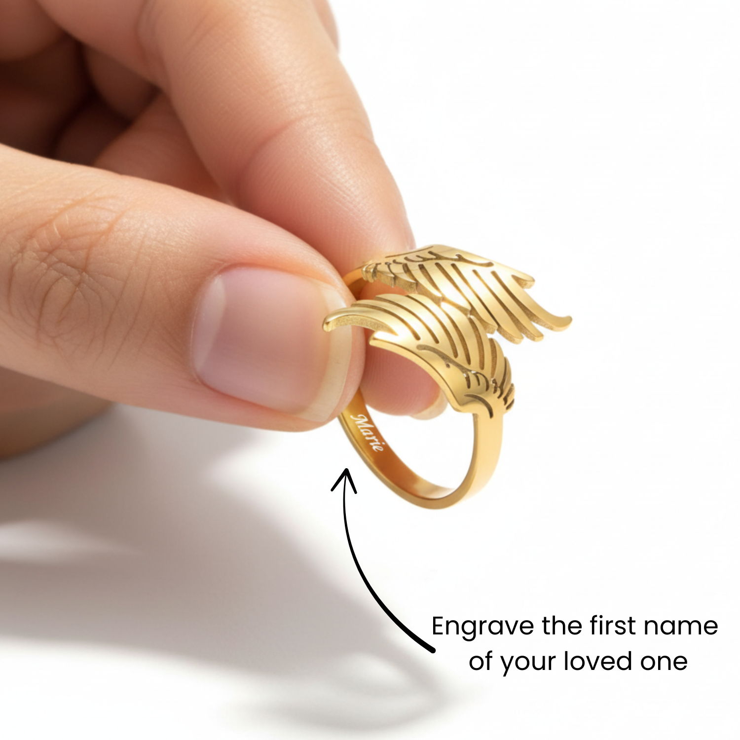 With its elegant angel wings design, this customizable ring is more than just a piece of jewelry, it symbolizes an eternal bond. Timeless and adjustable, it fits perfectly for any occasion, whether you're honoring a precious memory or expressing lasting love.