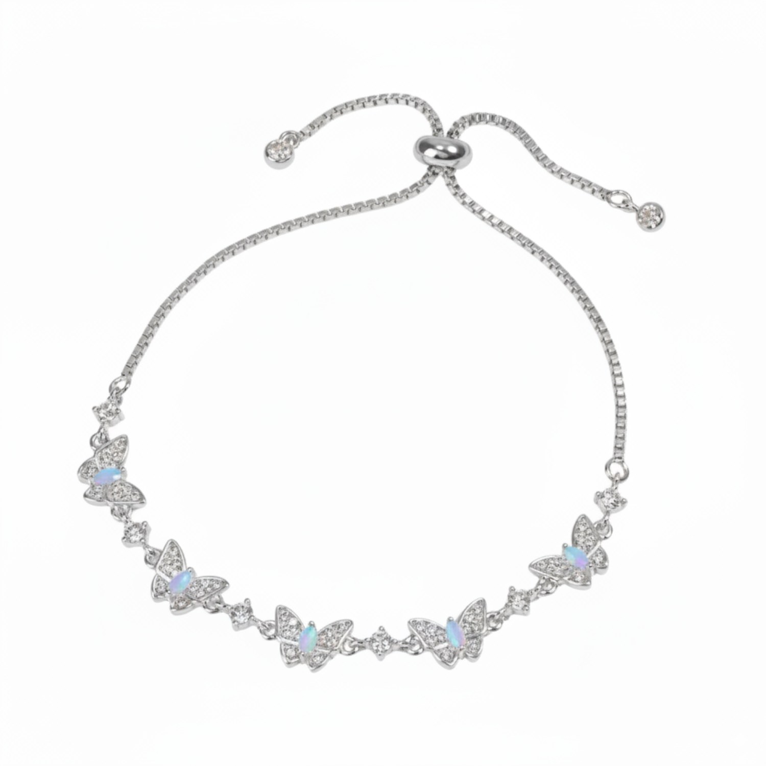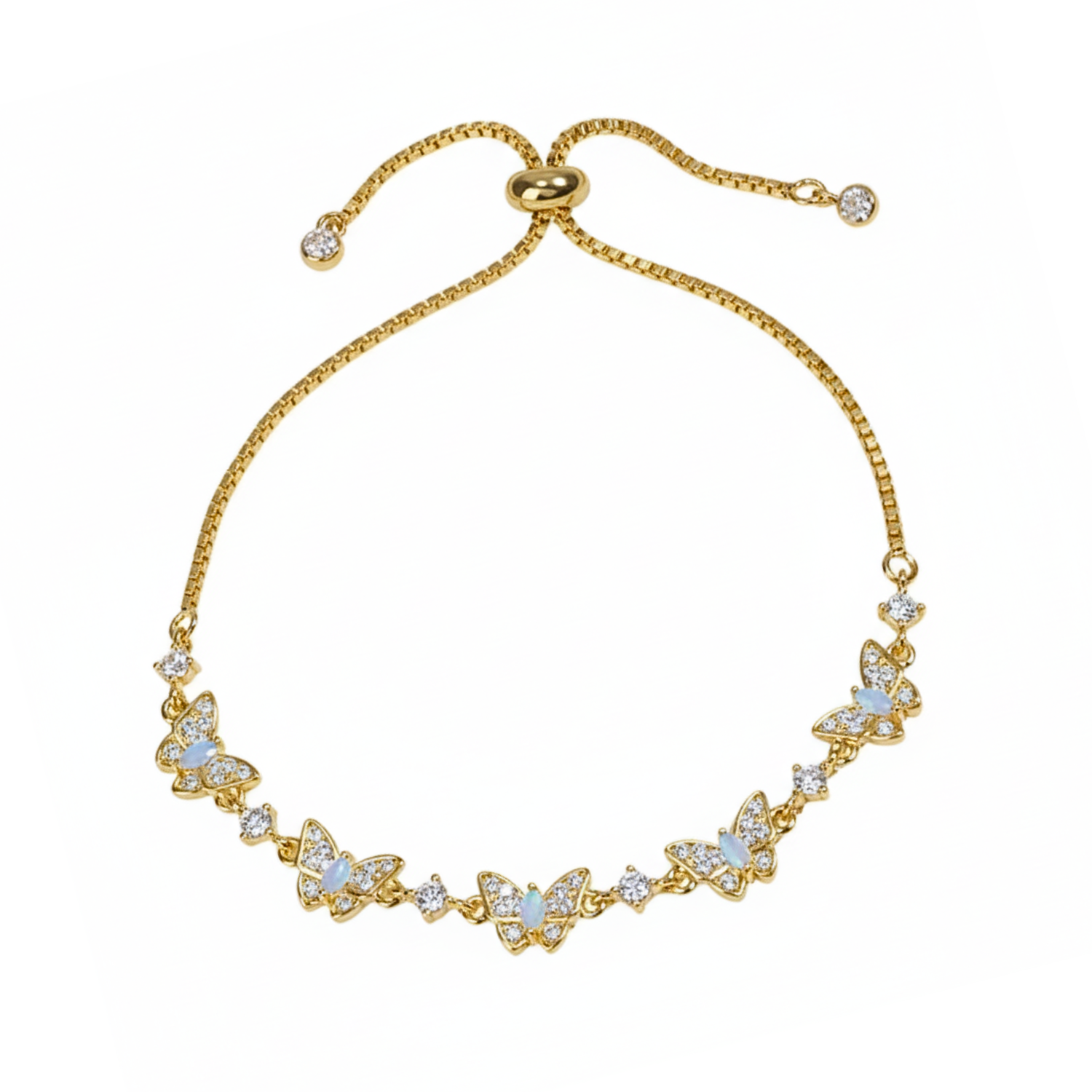 Let yourself be enchanted by the delicacy and sparkle of the Butterfly Glow bracelet, a refined piece embodying grace and lightness. Its sumptuous design showcases exquisite butterflies adorned with sparkling crystals, capturing the light with every movement to illuminate your wrist with a magical glow.