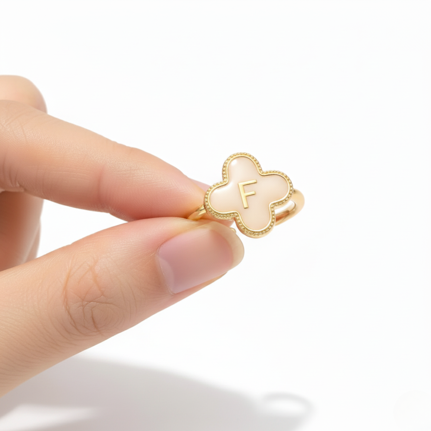 Express your personality with elegance thanks to our personalized clover ring. Each ring features a finely engraved initial at the center of a golden clover with a pearly finish, a timeless symbol of luck and happiness. The openwork design and adjustable open band make it both practical and refined, perfect for comfortably fitting any finger with style.