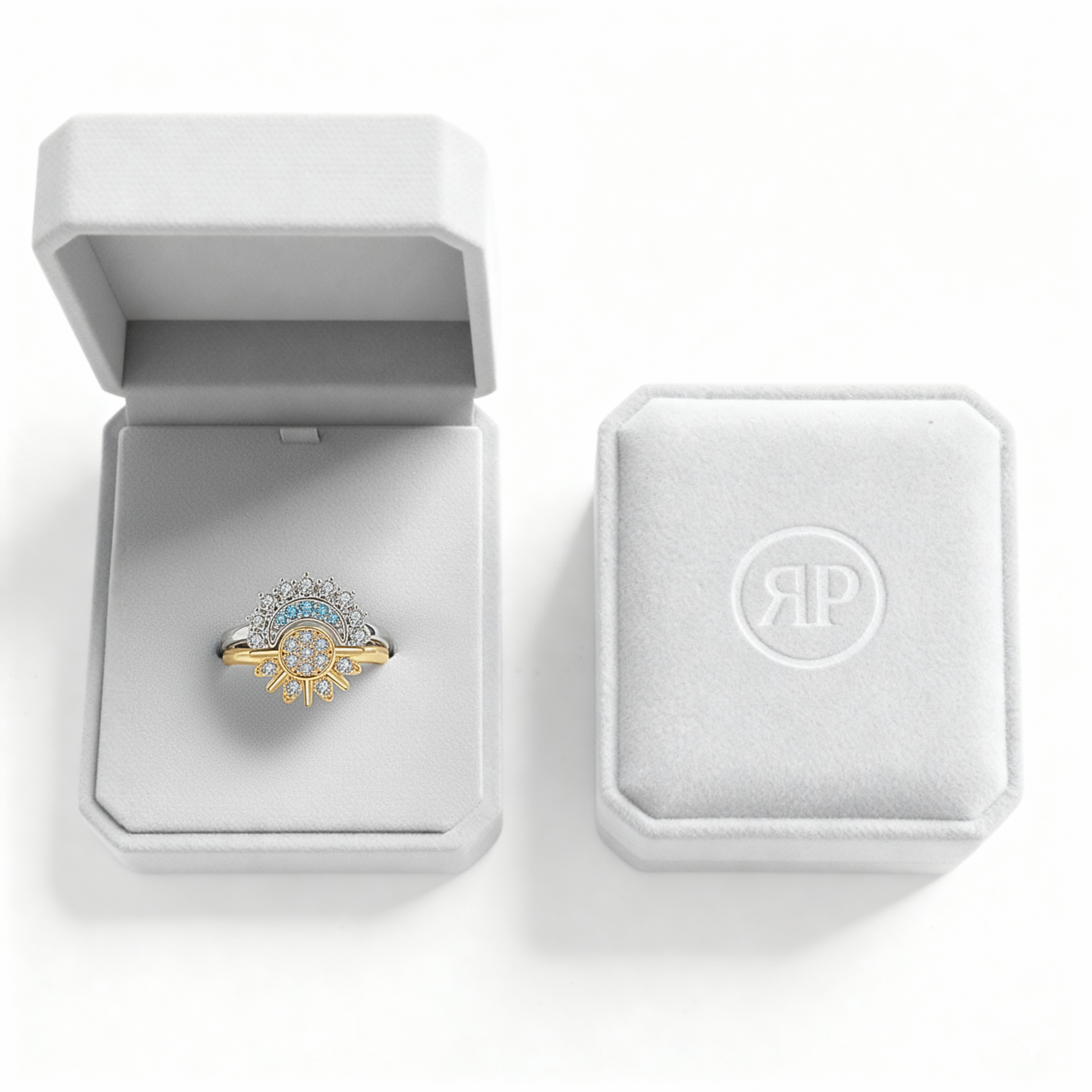Elegant and modern, the Eclipse Glow ring set embodies the perfect balance between minimalism and refinement. Its unique design consists of two rings, one shaped like the sun and the other like the moon, that fit together harmoniously when united, symbolizing unity and the unbreakable bond between two people.