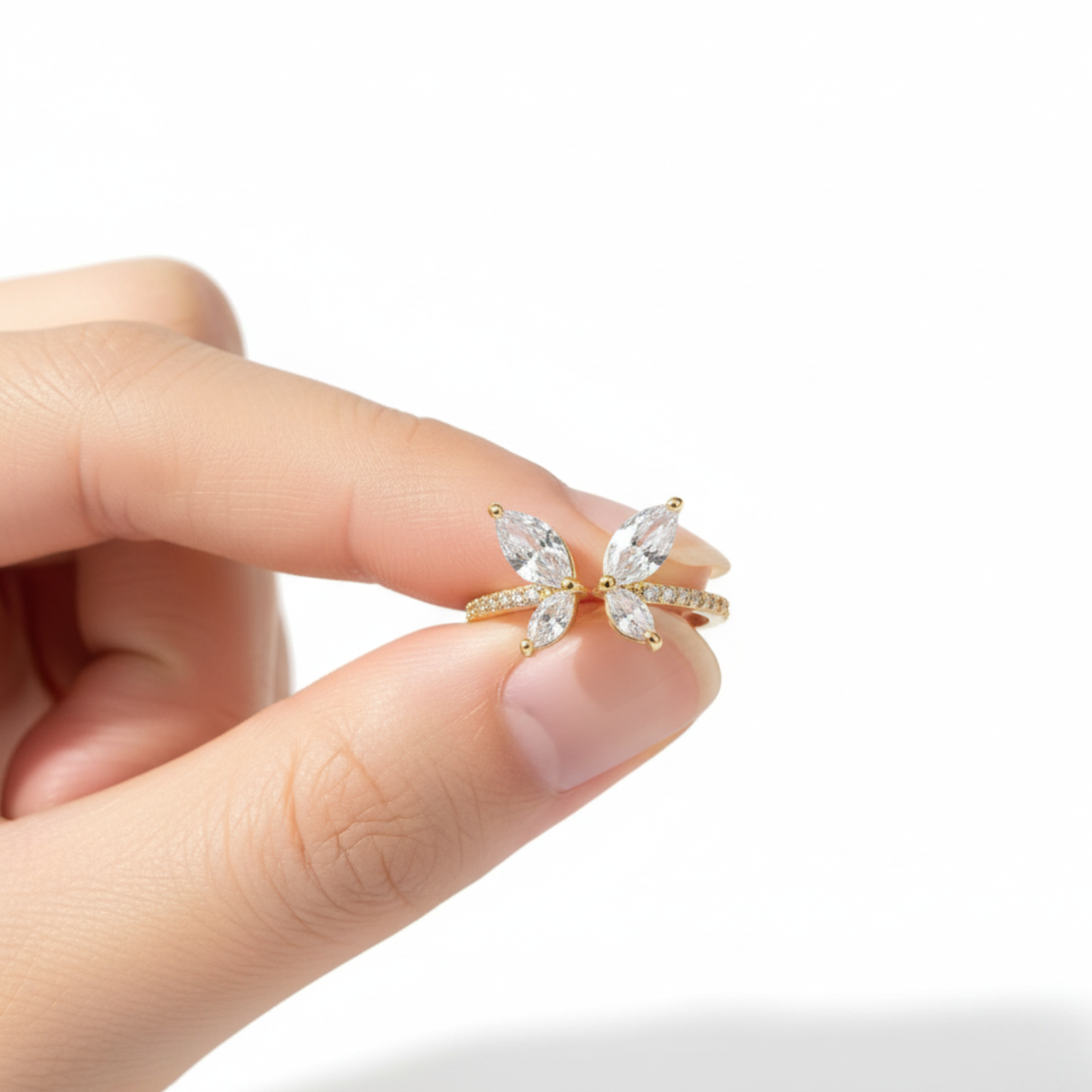 Elegance taking flight. This butterfly ring captures the delicacy of a suspended moment, where beauty and freedom meet. Its sparkling wings, adorned with stunning marquise-cut crystals, seem ready to come alive at the slightest breeze.