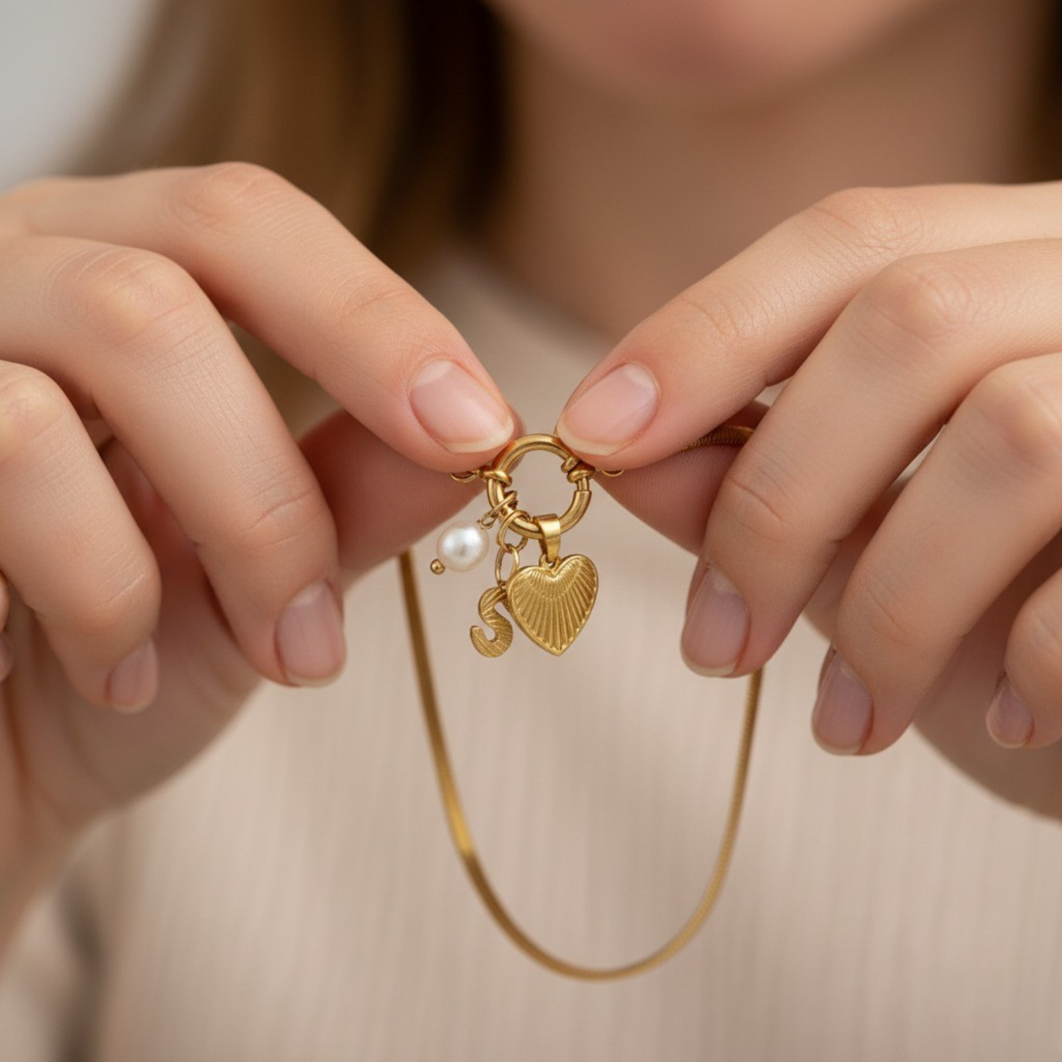 One necklace, three symbols. This unique piece brings together a personalized letter, a delicately textured heart, and a natural white pearl to create an intimate and elegant message. Each charm tells a story : a meaningful initial, love in all its forms, and the timeless softness of a pearl.