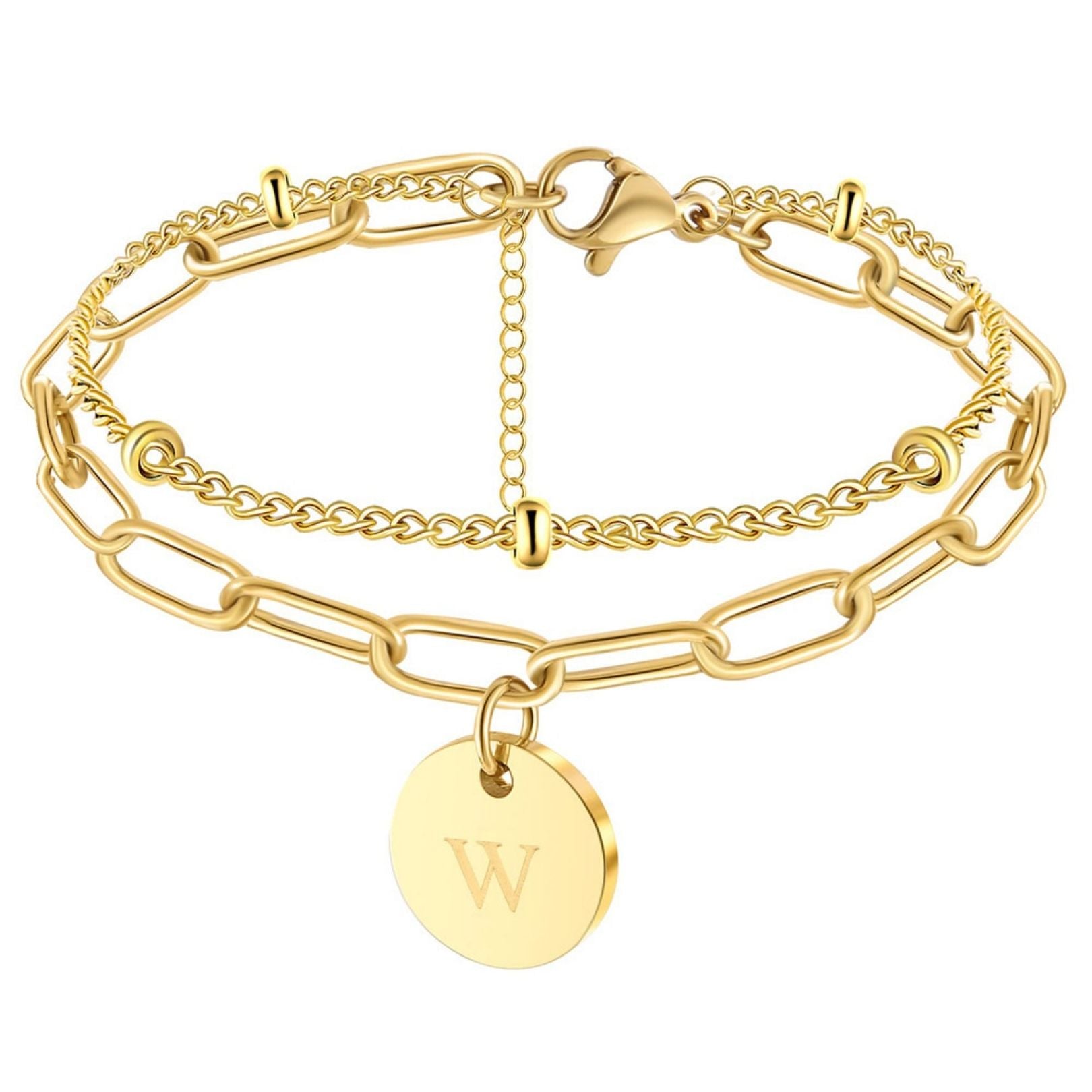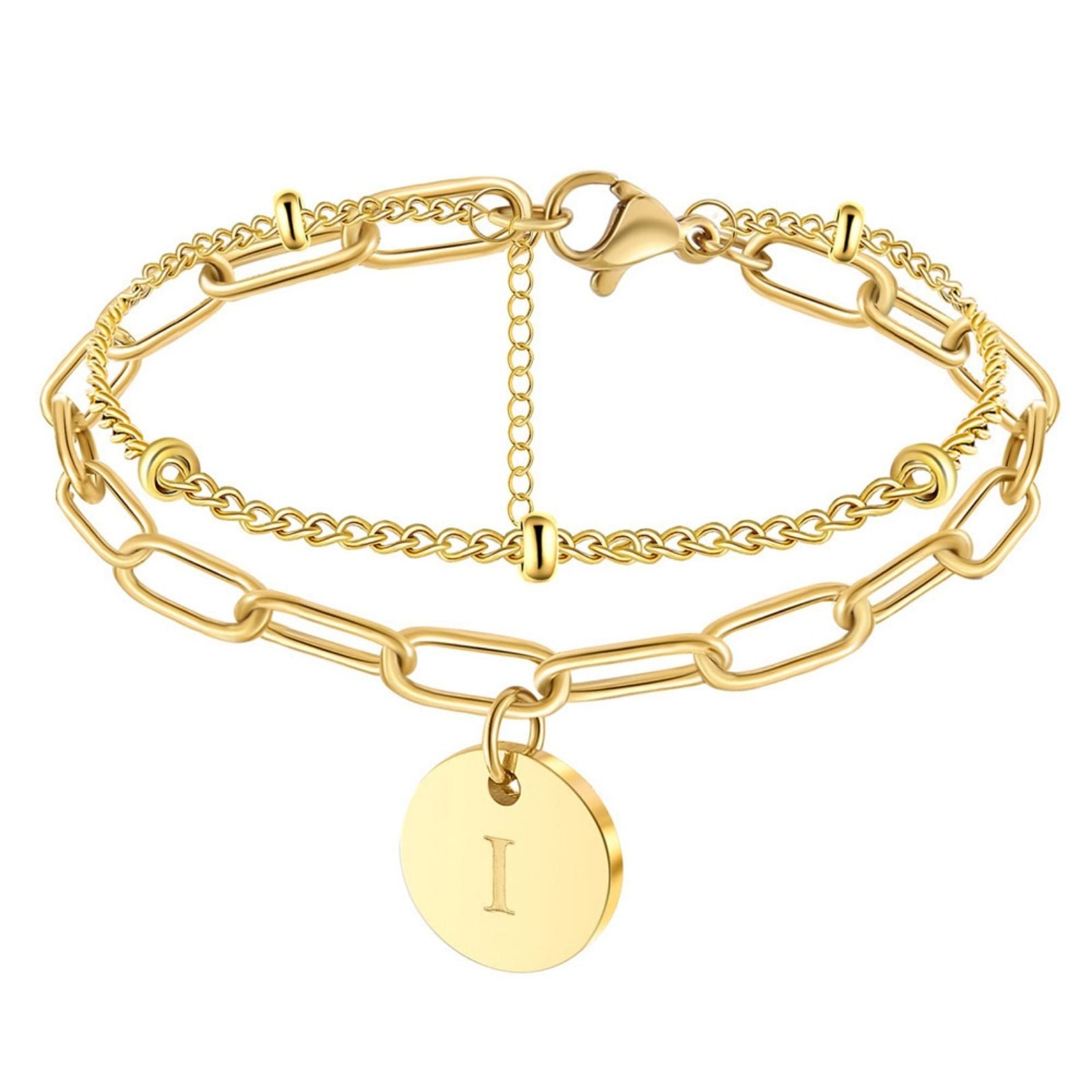 Express your style with elegance thanks to this double gold chain bracelet, featuring a medallion engraved with your initial. Designed to fit perfectly on the wrist, it combines finesse, shine, and character, creating a jewelry piece that is both trendy and timeless.