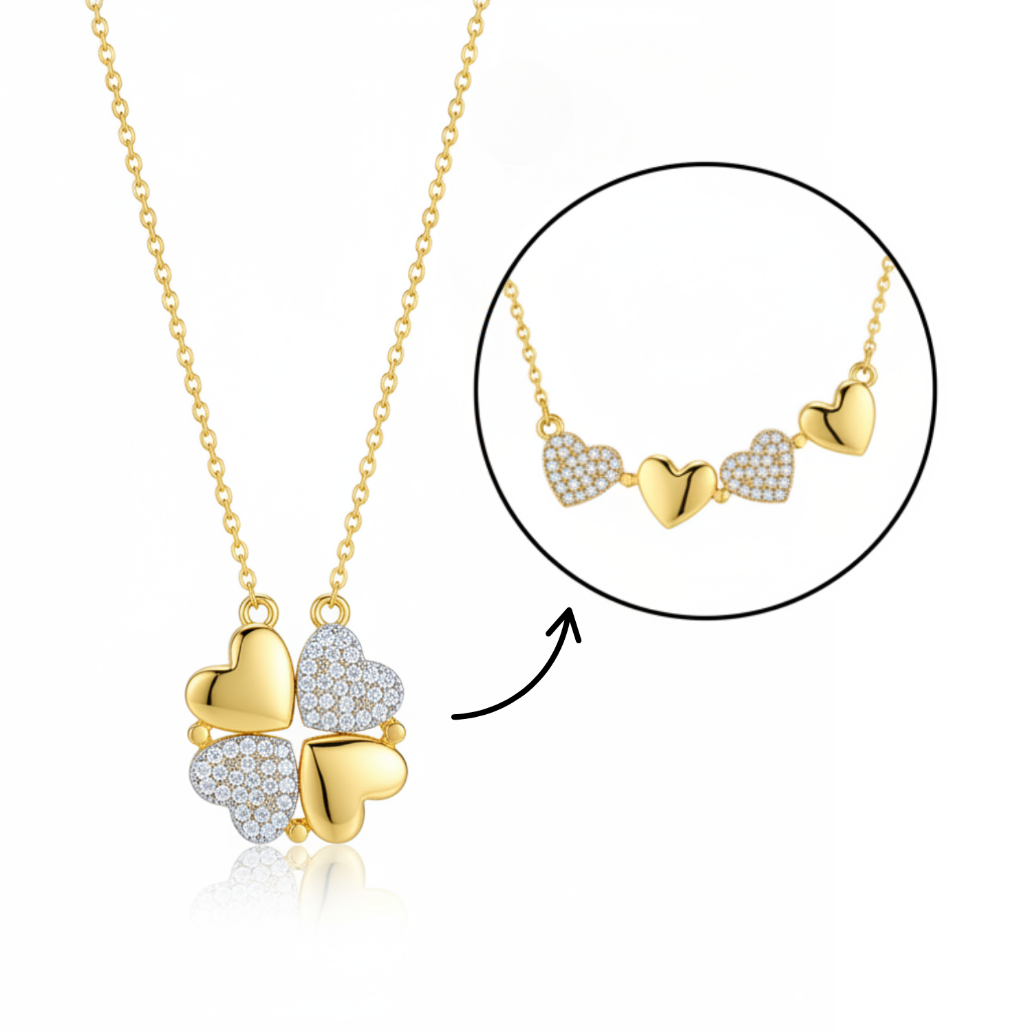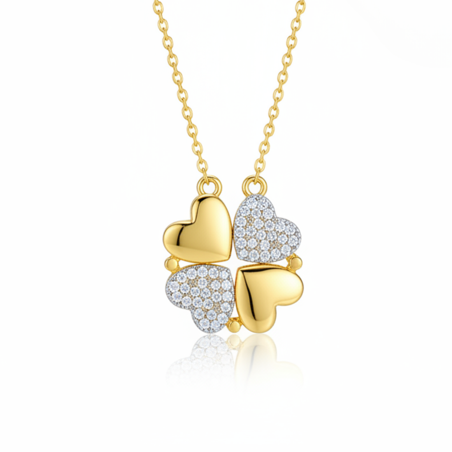 This necklace features four golden hearts, two shimmering with crystals, two softly polished, that come together to form a delicate four-leaf clover. A clever design blending romance and good fortune, crafted to accompany its wearer with grace and meaning.
