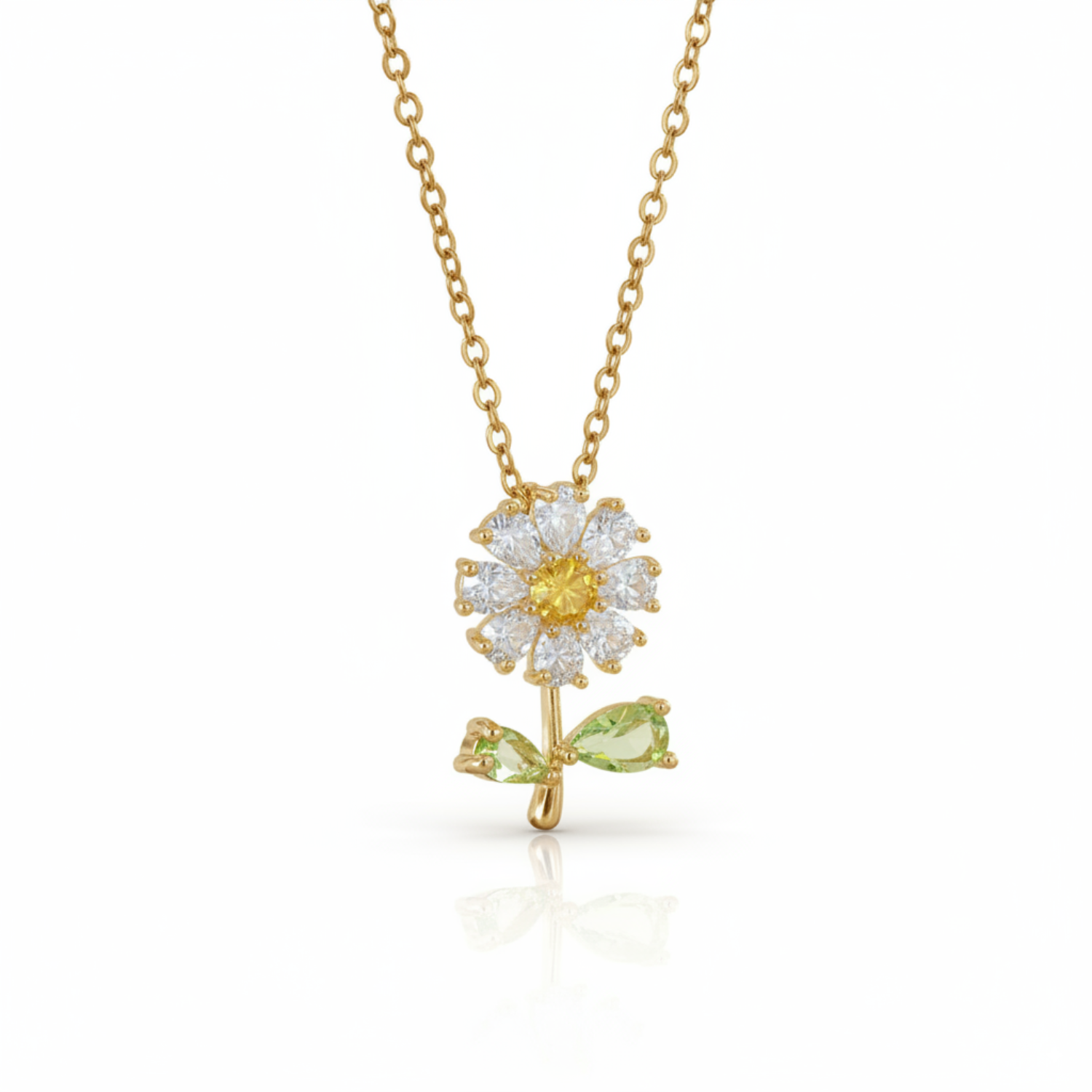 Set on an exquisitely fine gold-tone chain, this piece evokes the freshness of spring and natural elegance. Every detail is designed to subtly reflect light, adding a touch of softness and refinement to any outfit.