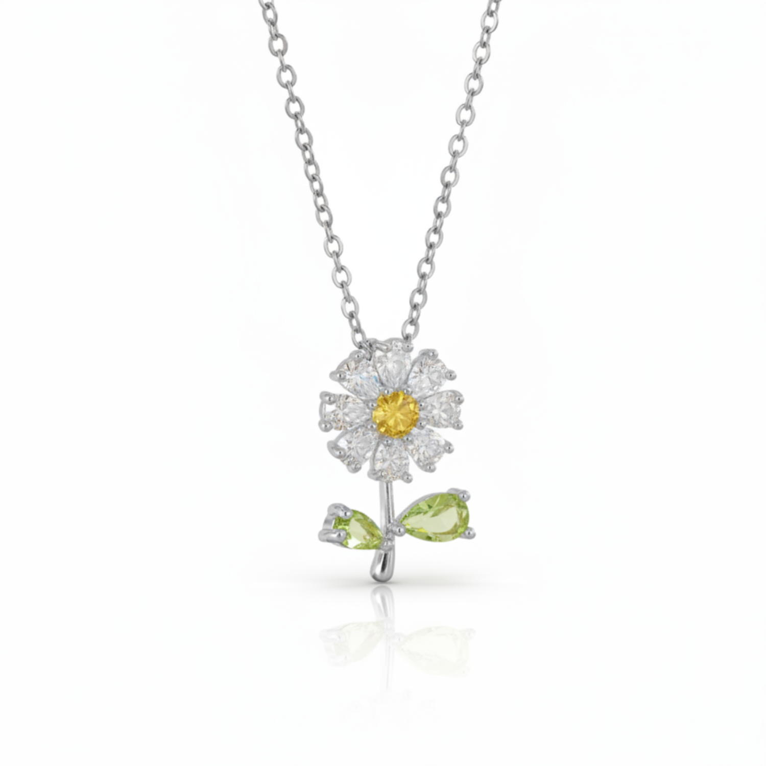 Delicate, radiant, and infinitely elegant, the Pure Bloom necklace captures the timeless beauty of a flower in full bloom. Its finely crafted pendant features a daisy with pearly petals, accompanied by crystalline leaves with soft green reflections.