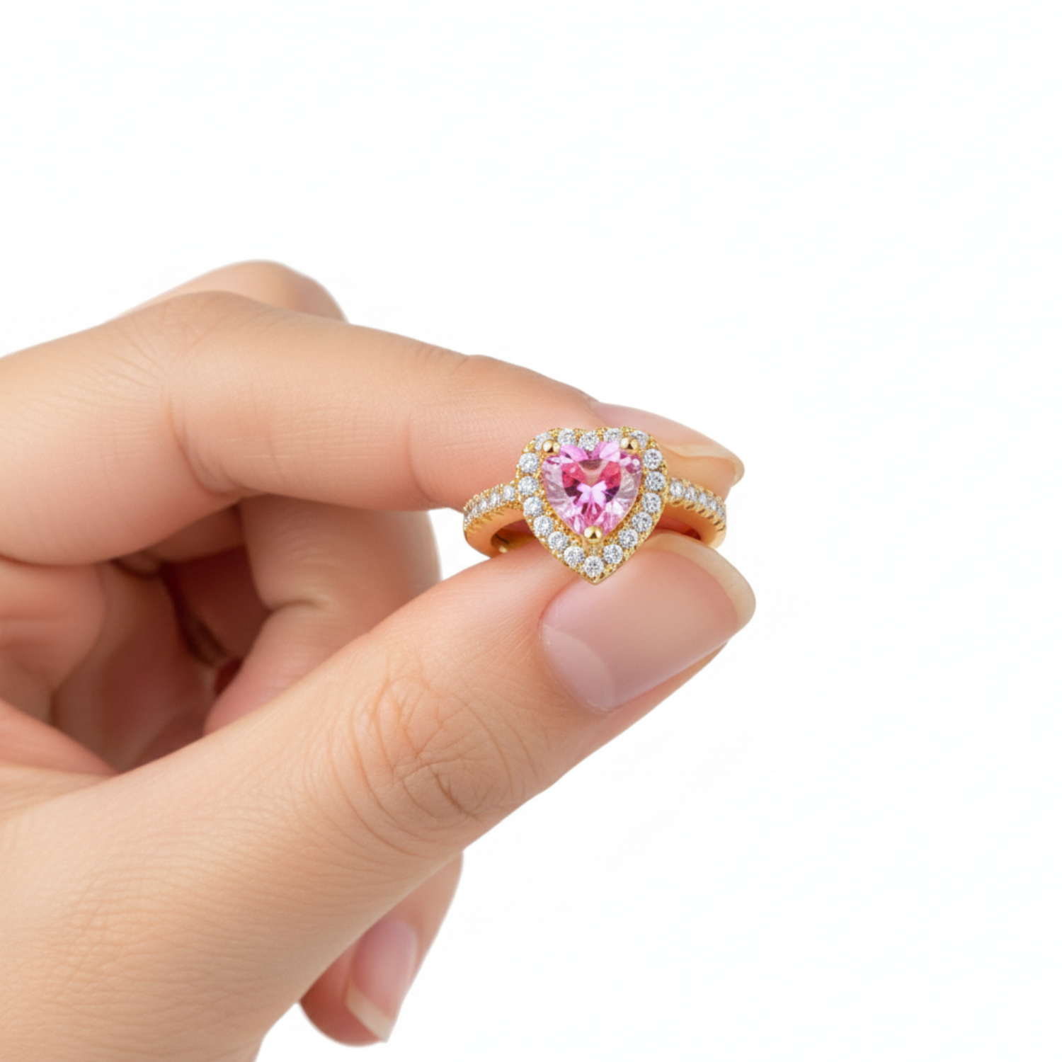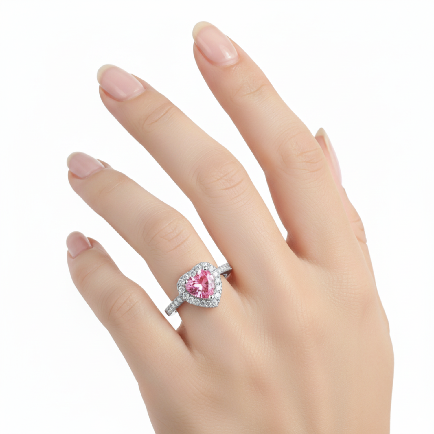 Elegant and radiant, Rosalyn embodies the tenderness of eternal love. At its center, a delicately cut pink heart is surrounded by a halo of sparkling crystals, like a breath of emotion captured in light.