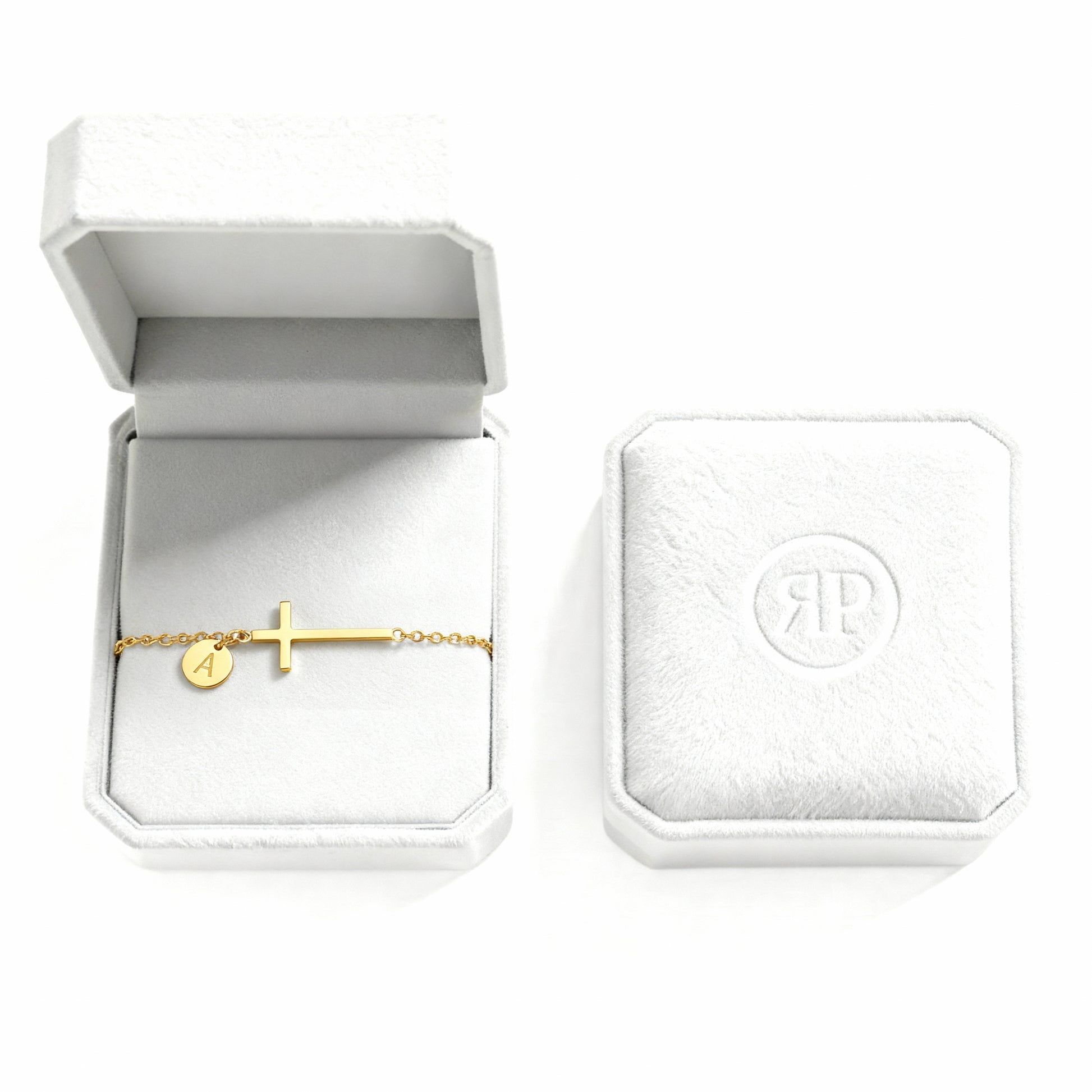 A gold-tone bracelet with a sleek cross and personalized initial charm. This minimalist design elegantly combines faith and identity in one beautiful piece.